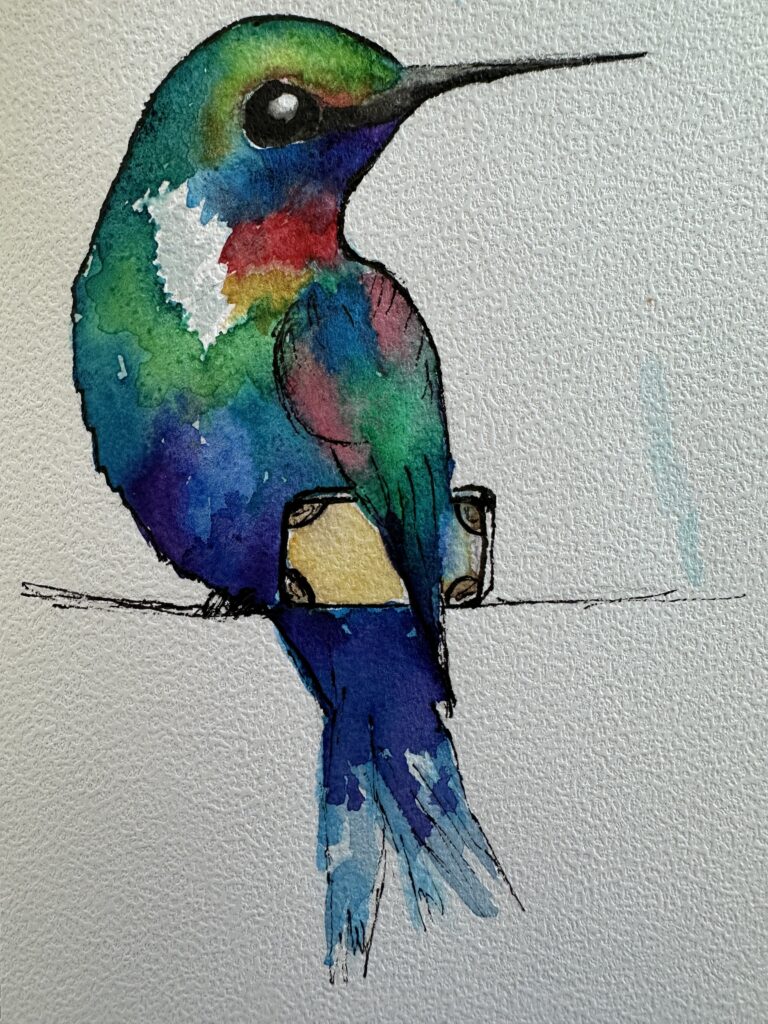 a small, glimmering visitor who often perches on the same branch of the pear tree near our home.